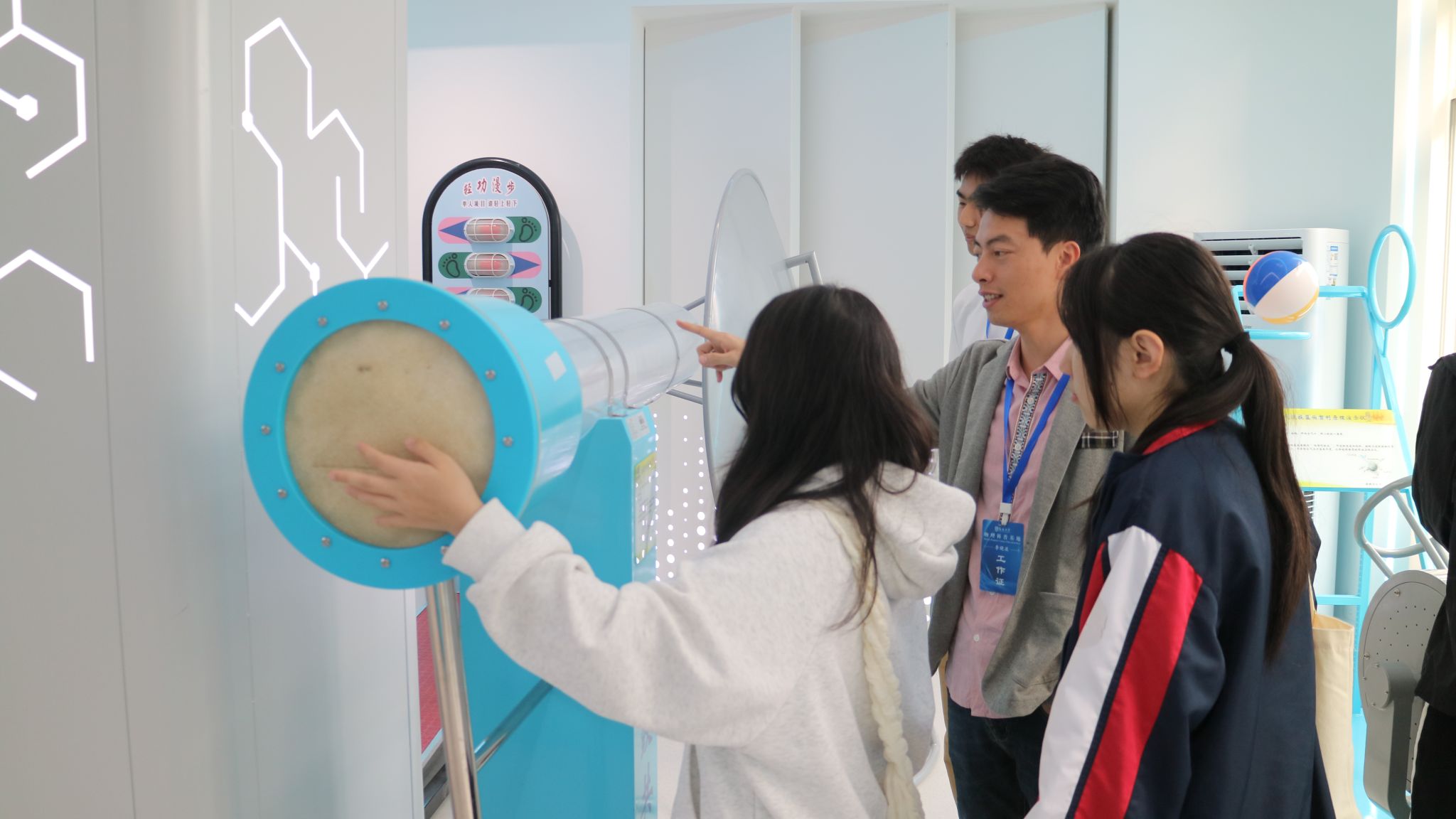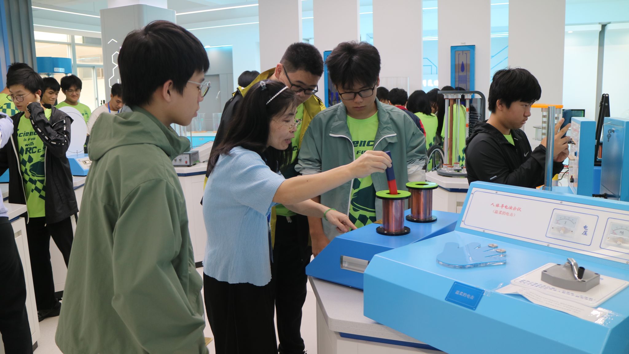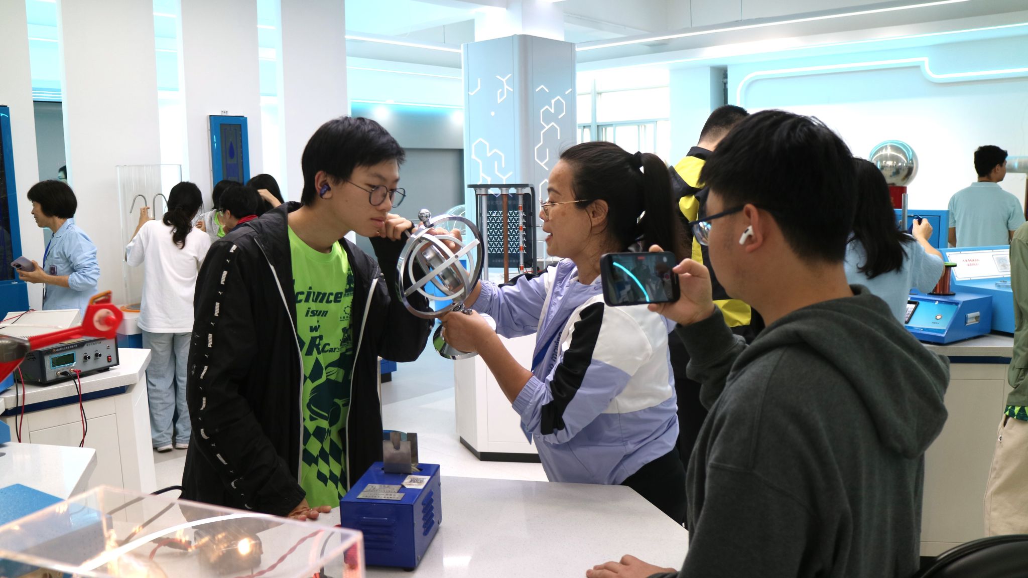 会前,研学团参观了校园,并前往物理科普基地,在物理与光电工程学院师生志愿者的指导下体验实验器材,探索物理原理。