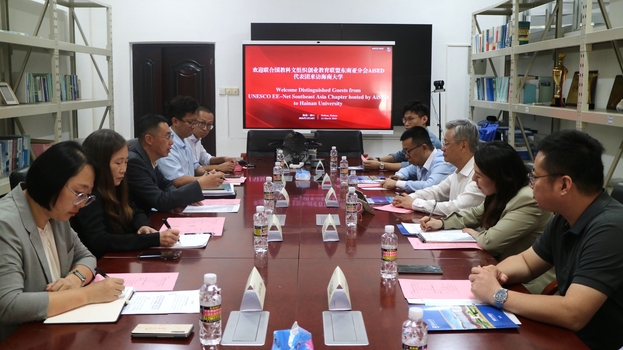 2026年3月24日下午,联合国教科文组织创业教育联盟(UNESCO EE-Net)东南亚分会亚洲可持续发展、创业与外交研究院(AiSED)主席、拿督谢锦成一行6人访问海南大学,并在海甸校区行政楼107A会议室举行座谈会。海南大学党委常委、副校长岳文出席会议。