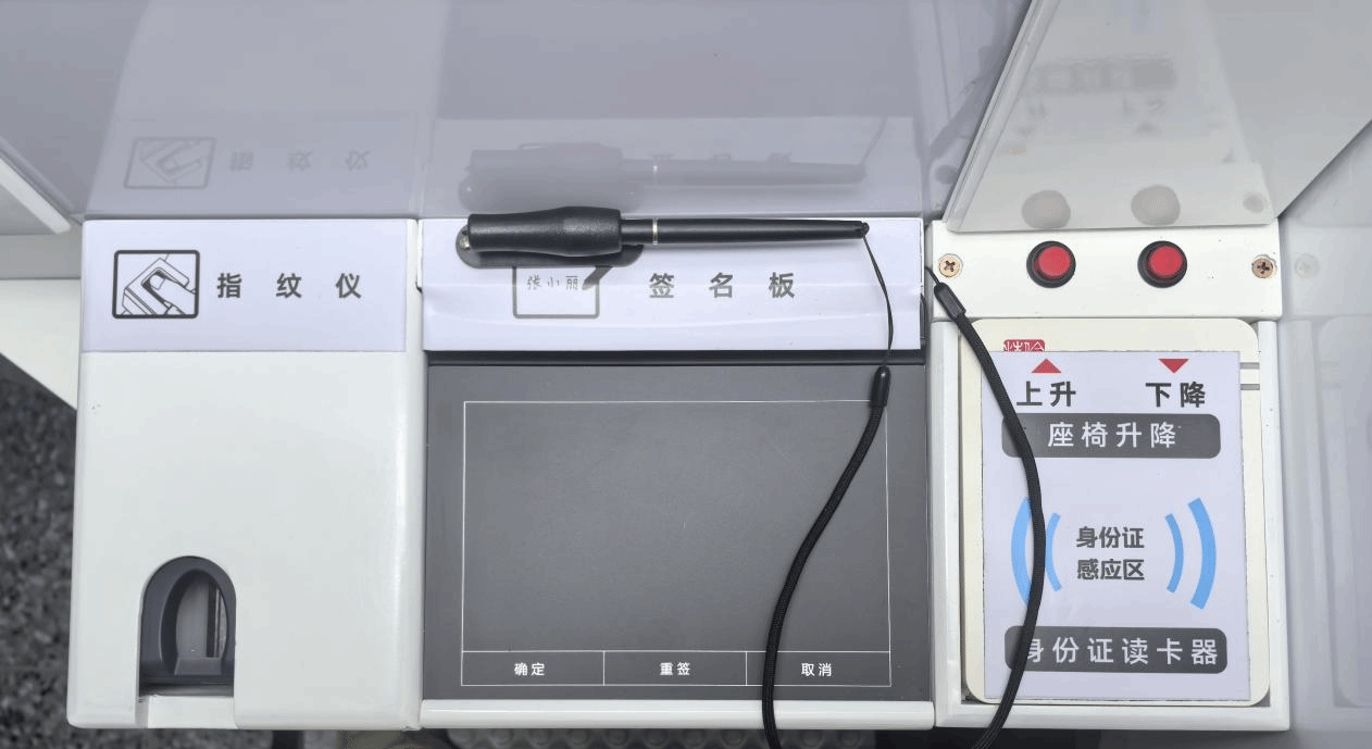 机器正前方为身份证感应区、指纹采集区、签字笔,请将身份证靠近感应区识别