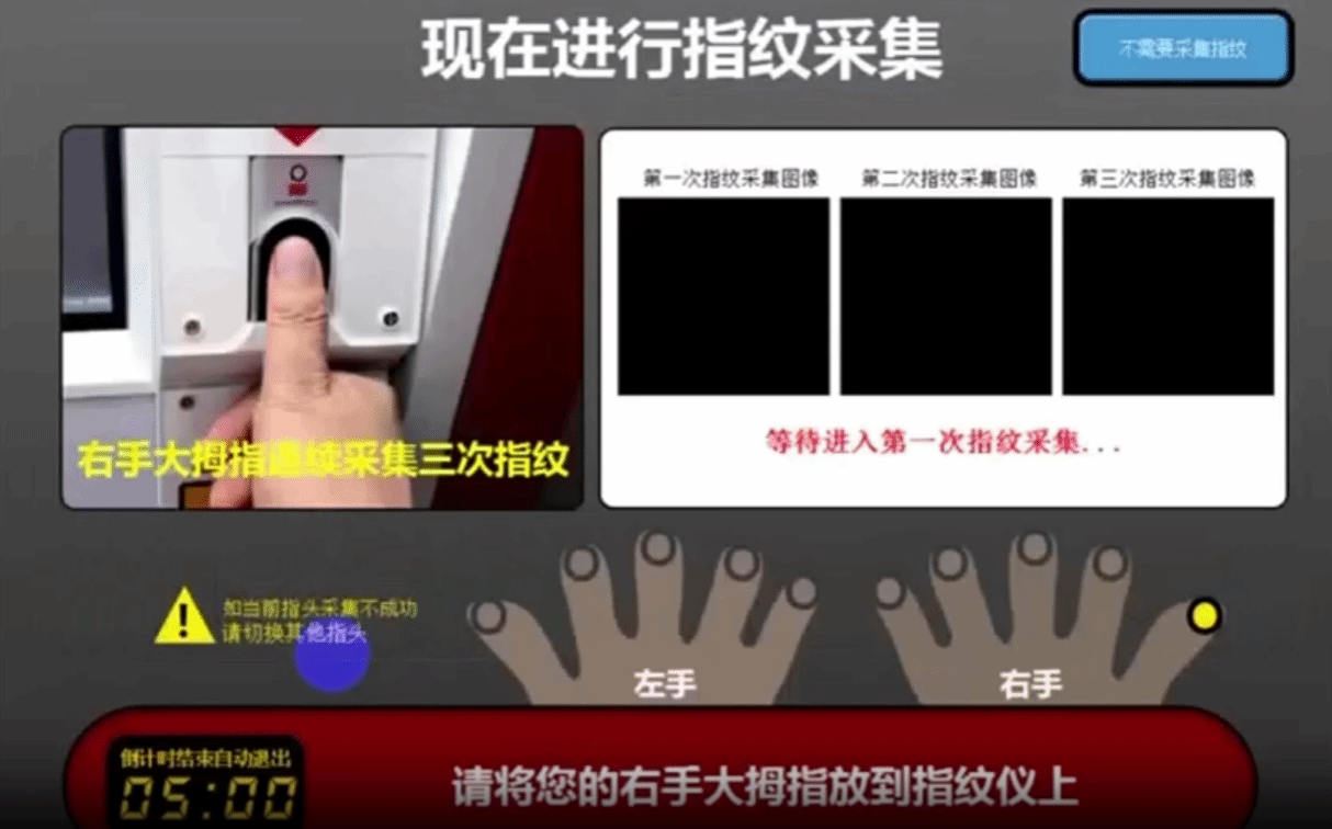按照语音及界面提示,完成指纹及签名采集,请使用机器上边专用签字笔正楷签名。